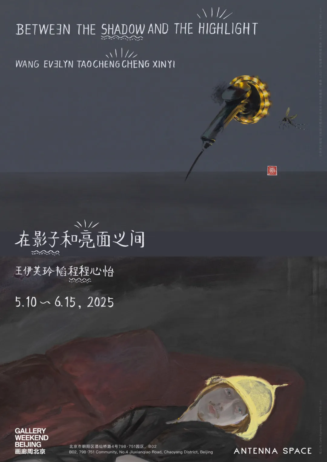 此次展览的题目借用两个词语“影子”和“亮面”进行隐喻,一对看似对立实则共生的元素,几乎贯穿了以绘画为代表的艺术创造的悠久历史。在图像张力与感知维度的交织中,它们周而复始而又前后辩证地出现,构建起从物质形态到精神场域的转换机制,恰似月缺月圆之轮回、晨昏线移之明灭、始终有无之辩证、虚实相生之界域、观者心象之两极。设计师田军基于北京空间在地因素的转换,结合其对历史人文的独到理解、消化、转译,以9个既独立成章又叙事连贯的展陈单元,带来更为延展的物理空间维度。不仅凸显出程心怡与王伊芙苓韬程在创作方法论上的分野,更引导、邀请观者在“文化转译”“微观叙事”“身体政治”等交叉议题中建立对话,共同思考。