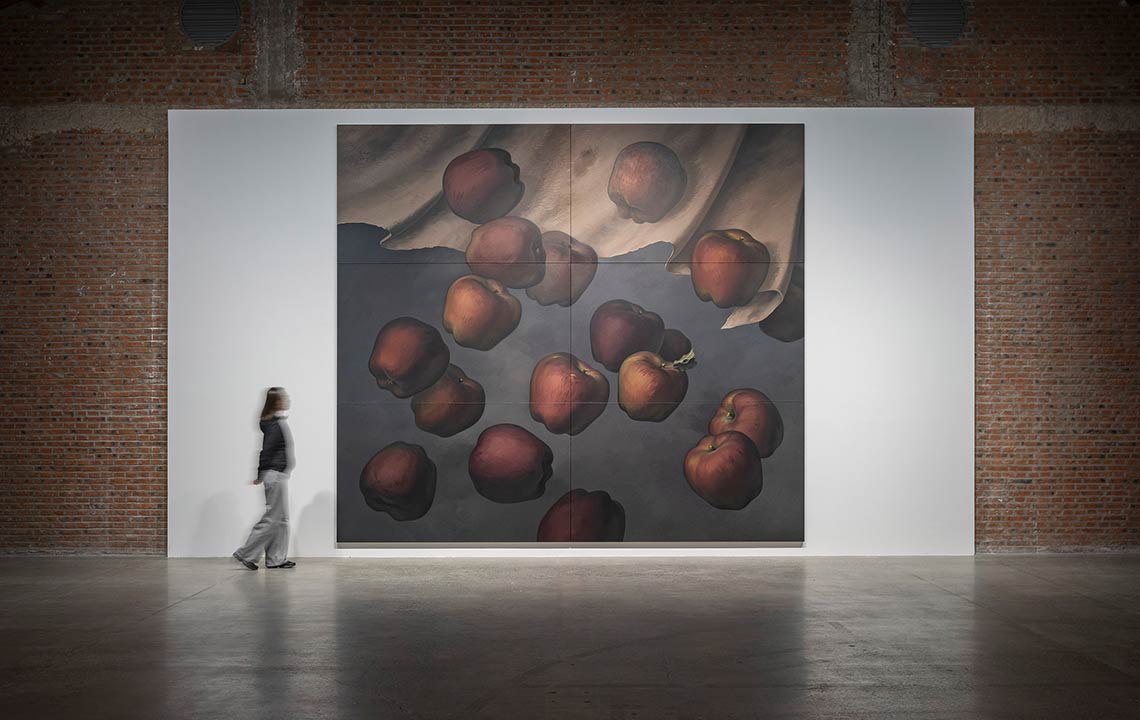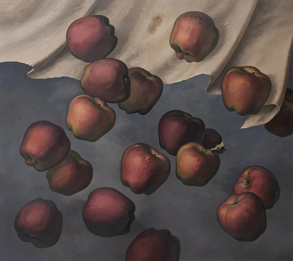 在“遗失的赤裸”中,苹果与布是最令人瞩目的一组关系。在闫冰的绘画里,对画面空间内部所做的安排,并非主要出于一种让画面获得其独立维度的愿望;尽管这些面目浓重的作物所占据的空间十分具体,从闫冰的画面中更强烈地透露出的是一种艺术家极为私人的感受。