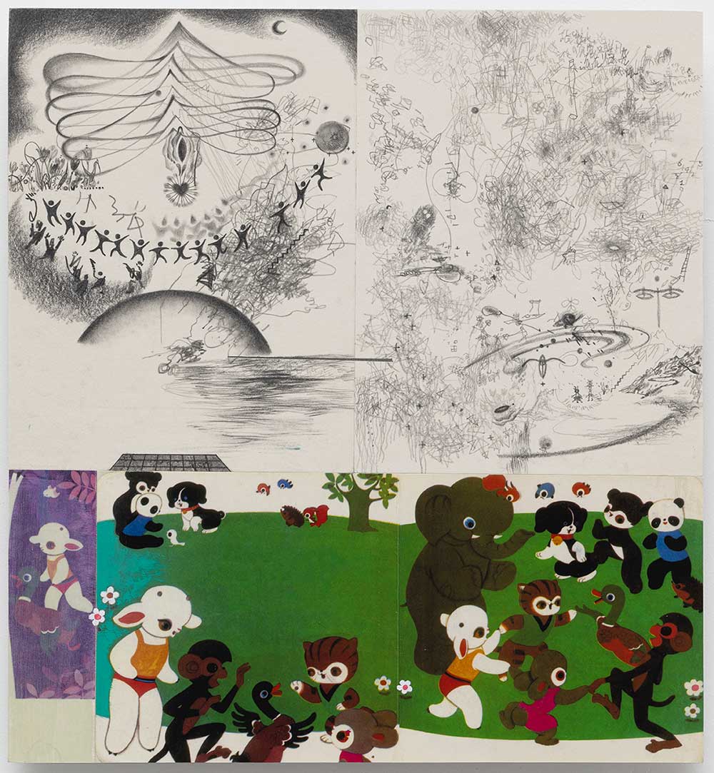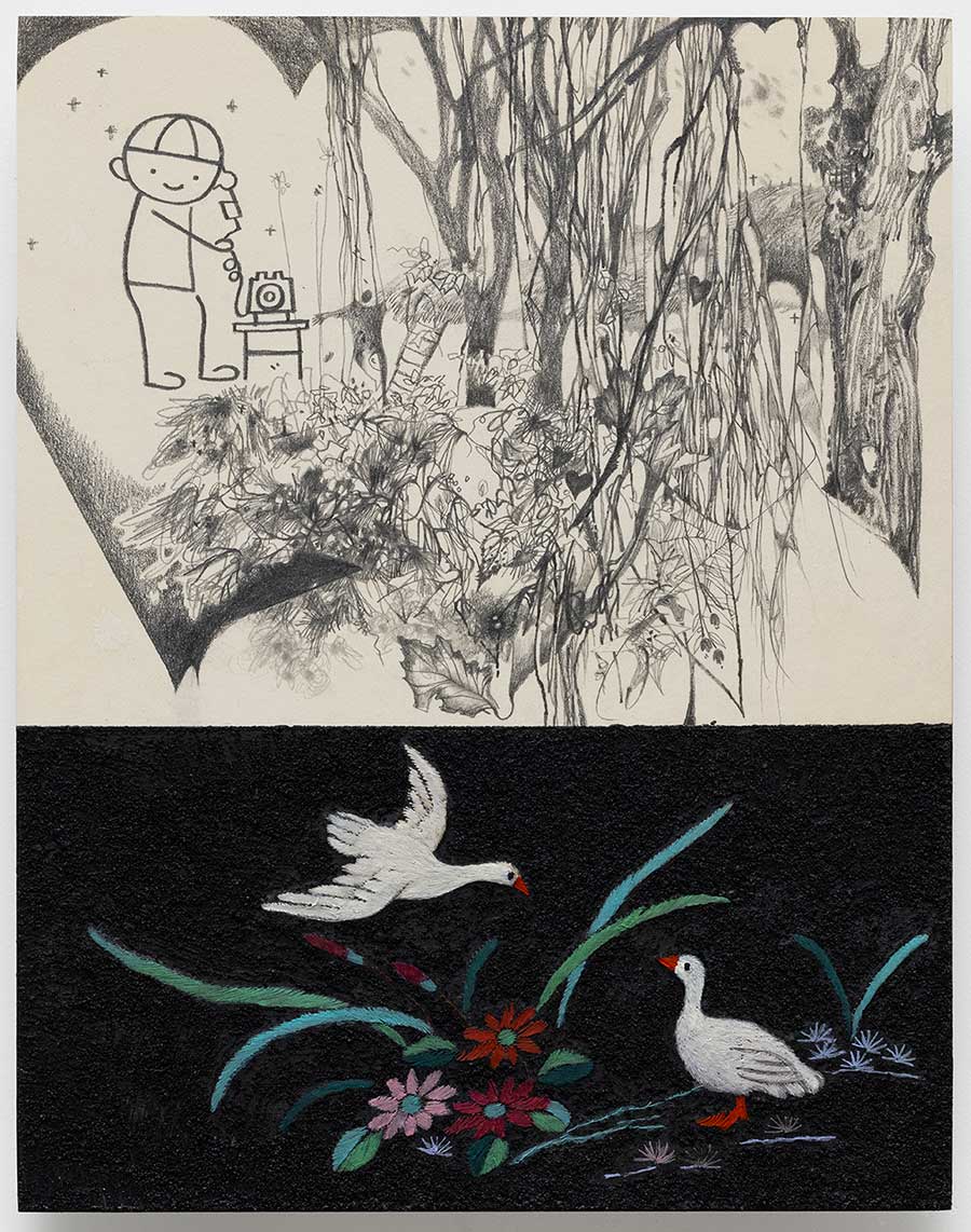 刺绣与织物在大志的作品中承载着对抗荒蛮的温柔力量。她将刺绣视为”爱与记忆的容器”。对她来说,针线不仅是技法,更是对母体与成长的隐喻。在一件以3岁画作为基底、名为”不要抛弃我”的作品中,童稚的笔触与成年人的技艺相互交织,完成对情感的修复与自我的召回。