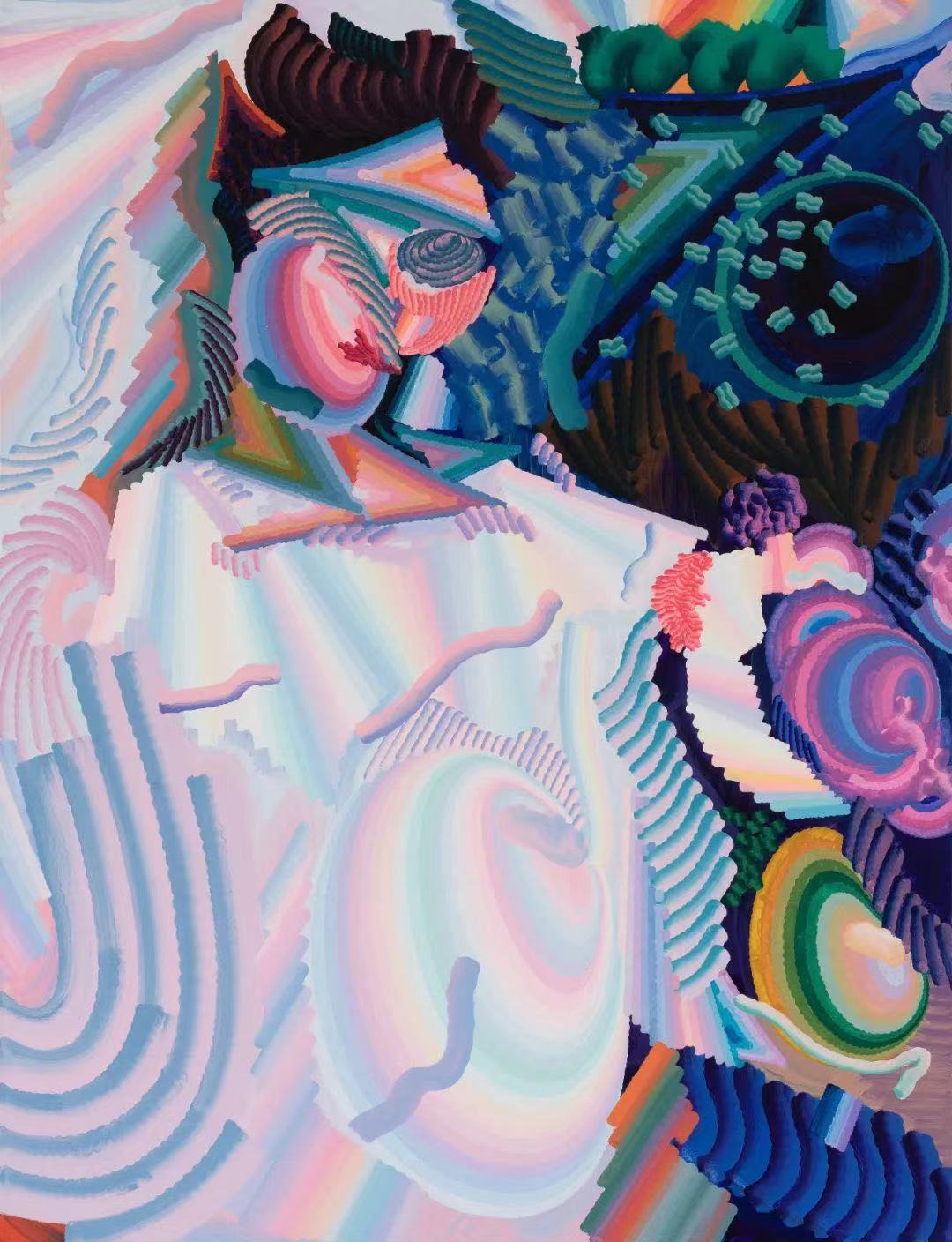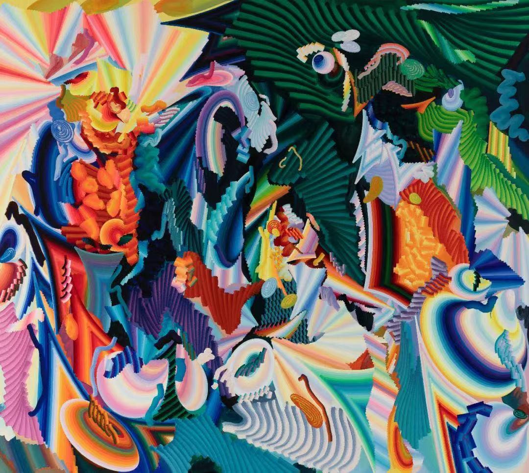 冯志佳的画作以色彩鲜艳的构图为特色。它们时而明亮得令人仿佛进入了幻境,时而与重复的线条、圆圈和锯齿形状相结合,产生一种运动或转化的感觉。这些重复的线条通常采用两种色调,有时是直线,有时是弧线或圆圈。在冯志佳的画作中,一切都处于变化之中,一切都在发生。他的构图永远不会停滞不前,仿佛画作本身就是一场动态的演化。