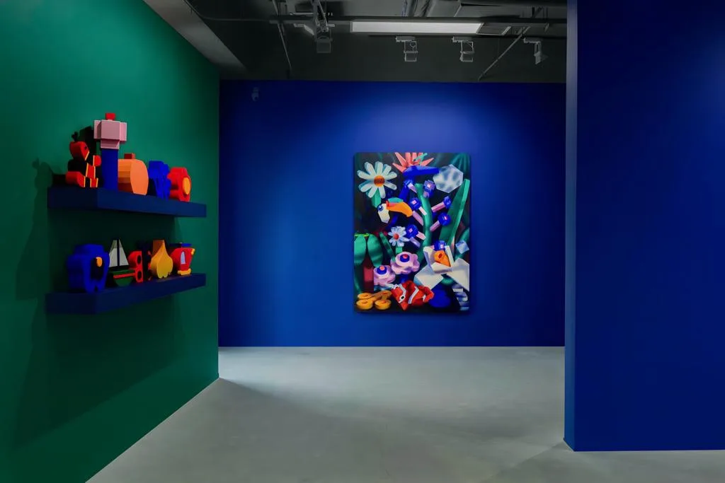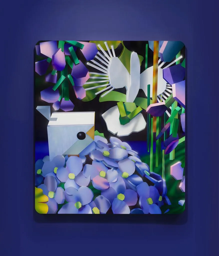 Tim Irani (b. 1989, Orange County, California) is an artist living and working in Los Angeles. He has an architecture degree from the University of San Francisco, and a background in mobile product design. His artistic practice explores optimisation in a digital age, the pace with which the technological development renders current trends obsolete, and the nature of reality. Irani’s art draws on elements of computer-generated imagery and pop art, combining traditional painting techniques with sculpted wood elements to showcase a playfully distorted, plant-clad, man-made environment where technology and the natural world coexist in careful balance.