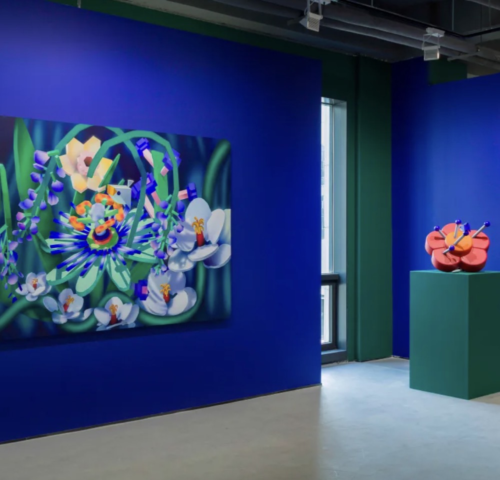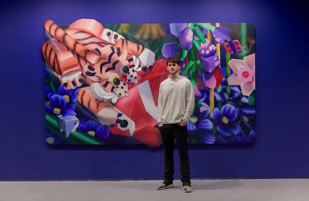 大胆的亚克力颜色与模糊的、人工操纵的线条相结合,描绘了动物从超现实主义风景背后小心翼翼地向外张望,风景中有闪电和层叠的花朵,花瓣坚硬、厚实。