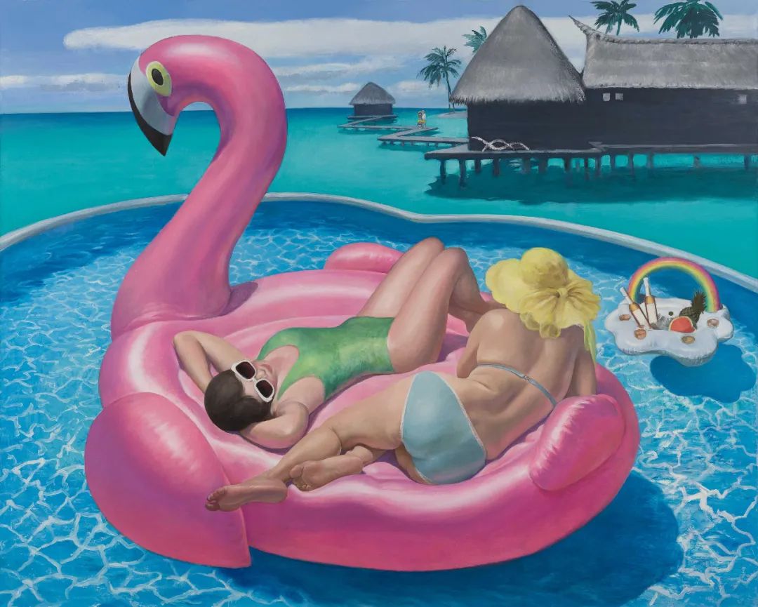 展览以“度假”系列开篇,以明媚的海岛为背景,勾勒出疫情期间艺术家对于旅行和假期的美好遐想。艺术家因其对经典形象的戏仿与挪用,游戏于精英艺术与大众文化之间。