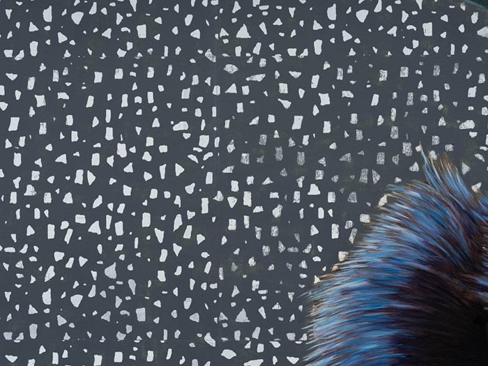 在《鸡鸭鱼肉》(2023) 中,生禽与鱼类铺陈在铝质表面上,鲜肉闪烁着庄严而近乎神圣的光泽;剥皮的家禽整齐排列,一只鸭的脖颈轻覆在大理石般的红肉之上,四条鱼安置其下,点缀以新鲜水果,构成精心平衡的三角形构图。所选食材呼应中国传统宴席中的“四大菜肴”,象征丰盈与吉祥。通过对比例与视角的巧妙处理,赵刚将寻常的家庭景象升华为宏大而富有仪式感的画面。画布上的物体被视为一种另类的肖像,个体身份在欲望、权力,和东西方价值观的交织中被“吞噬”和重构。赵刚曾表示:“你可以把肉看做另一种肖像……做饭是纾解自己常年、常态的焦虑的一种方式……艺术家其实最重要的一个就是对自己的身份认知,这更是一个创作者富有使命的部分。我自己最大的痛苦就是身份问题,当代艺术家的任务、使命就是把自己的痛苦告诉别人,所以当代艺术不是关于美与艺术,或者哲学,而是表达自己的情绪和困惑。”