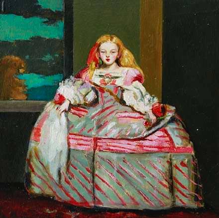阿德莉娅·桑托莉乐于在巴掌大小的作品中描绘“禁忌”——去揭示我们通常试图隐藏的内容、或是想要保守的秘密。她擅长将西方神话元素进行挪用与再创作,笔下的女性角色普遍具有相同的特征:自在地直视着观者的眼神、“反”固有服饰的简化描绘、披散的长发等等,这些表达都体现着女性角色的自信与不受束缚,以及对于不同身份定义的反对。她通过笔下女性直刺而来的眼神,主动与观者、与艺术史传统进行着一场自信的对话。这是一种以“守”为“攻”的策略,她坚守在架上的方寸之间,却以现代性的笔触向古典法则发起了冲锋。