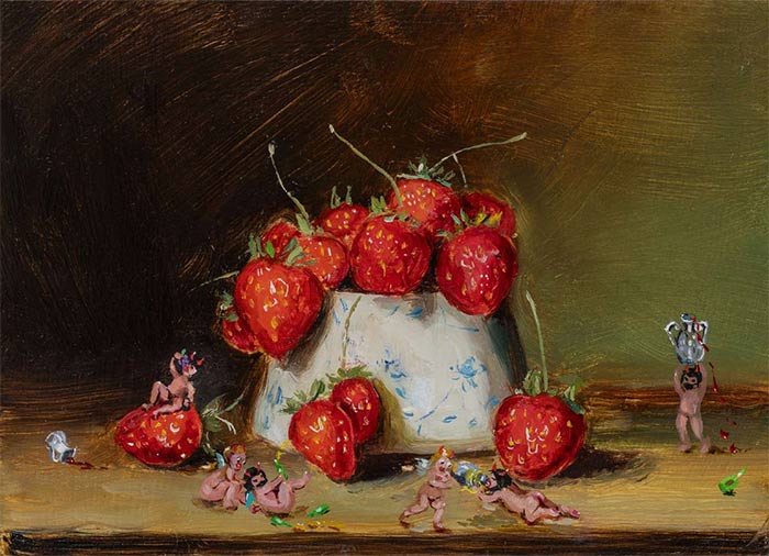 艺术家借助观念调侃现实,画家的方式则更倚靠笔下的重构。当阿德莉娅引用鲁本斯、布歇等大师的图式,并加入草莓、蝴蝶、古怪的蕾丝等个人化、现代甚至略带戏谑的元素时,这种重构剥离了原作的部分神圣性,注入了画家的个人情感和现代视角,使得古典题材与当代观众之间产生了新的、有时甚至是令人不安的联结。这更像是一种温和而智慧的“弑父”(艺术史之父)行为,也是画家在严苛的技艺要求下,一种冷静而自信的战略选择。